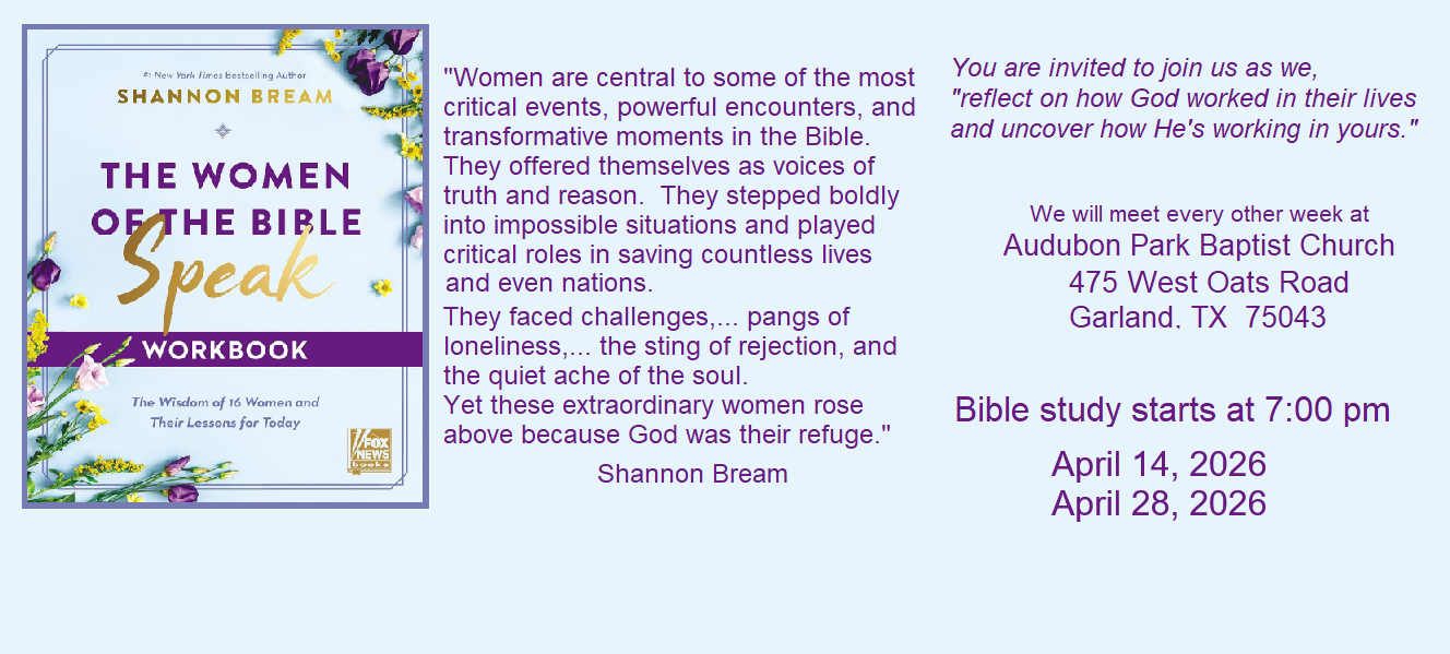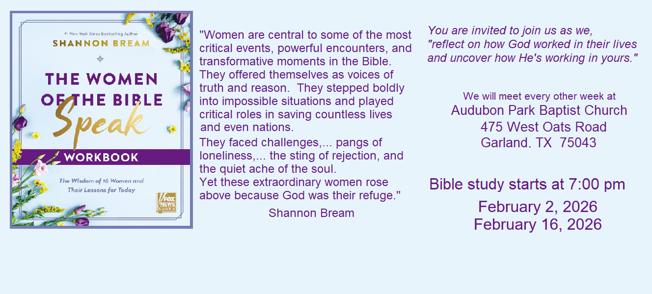 Audubon Park Baptist Church, in Garland, Texas, is a Southern Baptist fellowship of caring believers. We are also affiliated with the Southern Baptists of Texas Convention and the North Texas Baptist Area Association (NTBA). A summary of our beliefs is found in the Baptist Faith and Message 2000.
